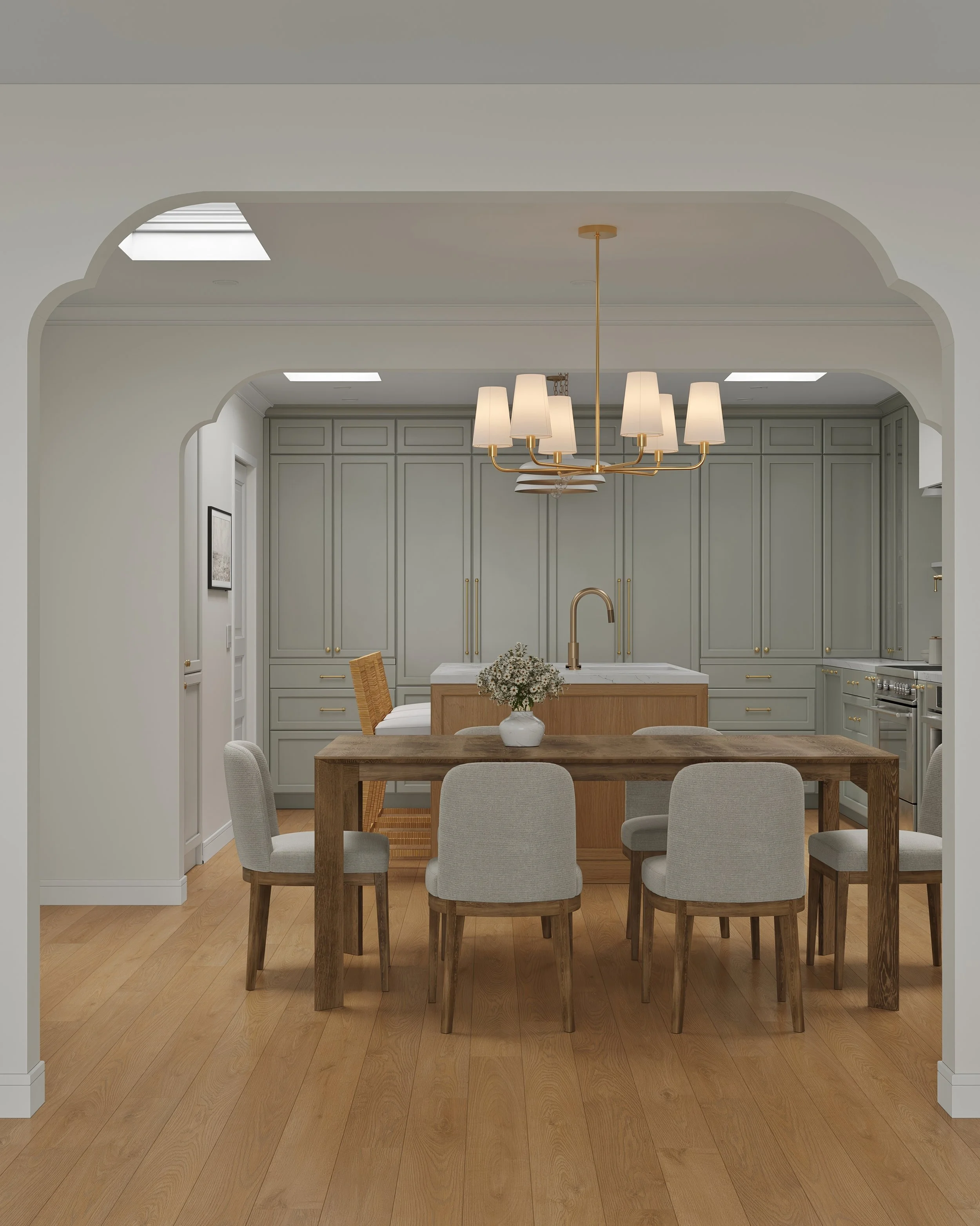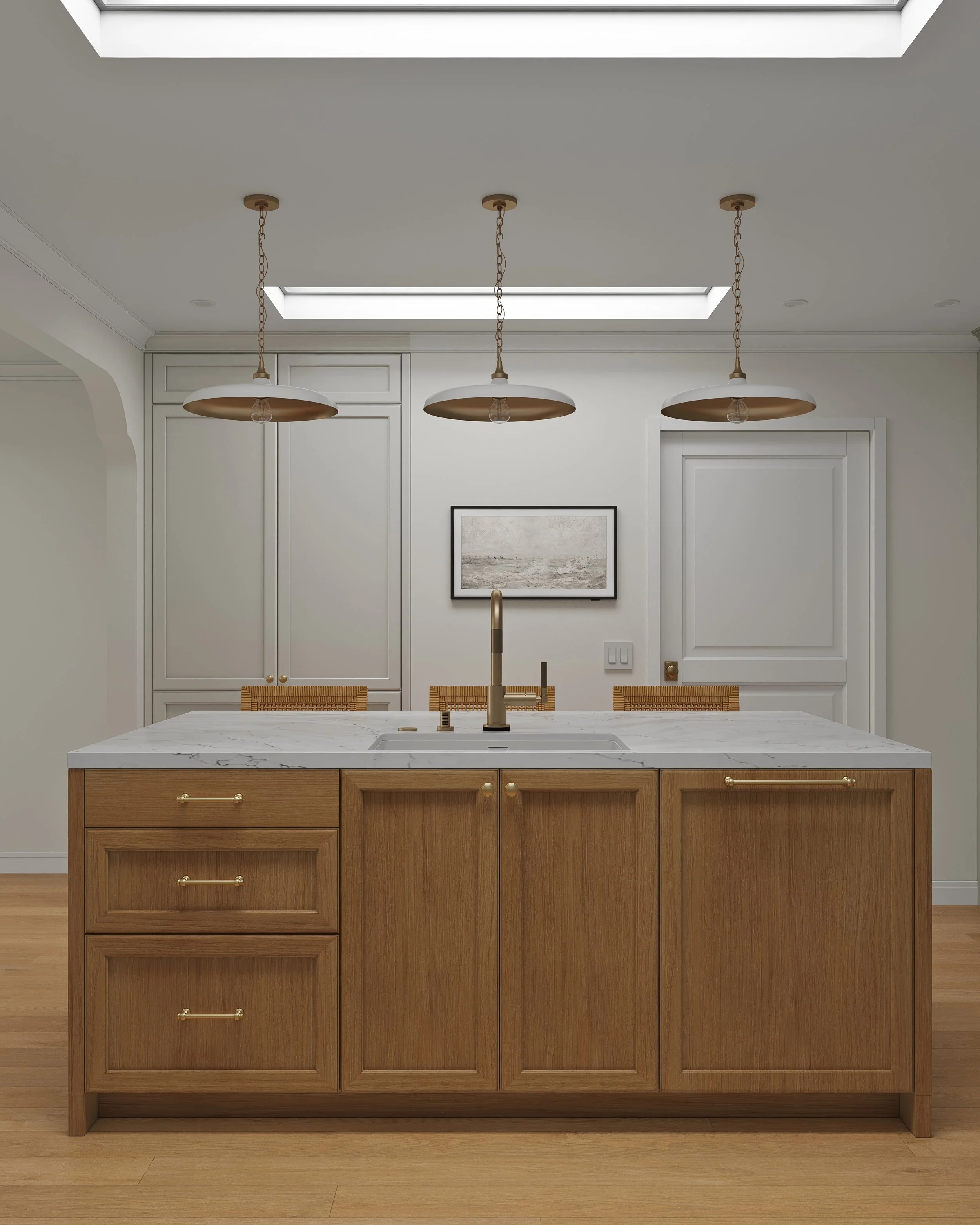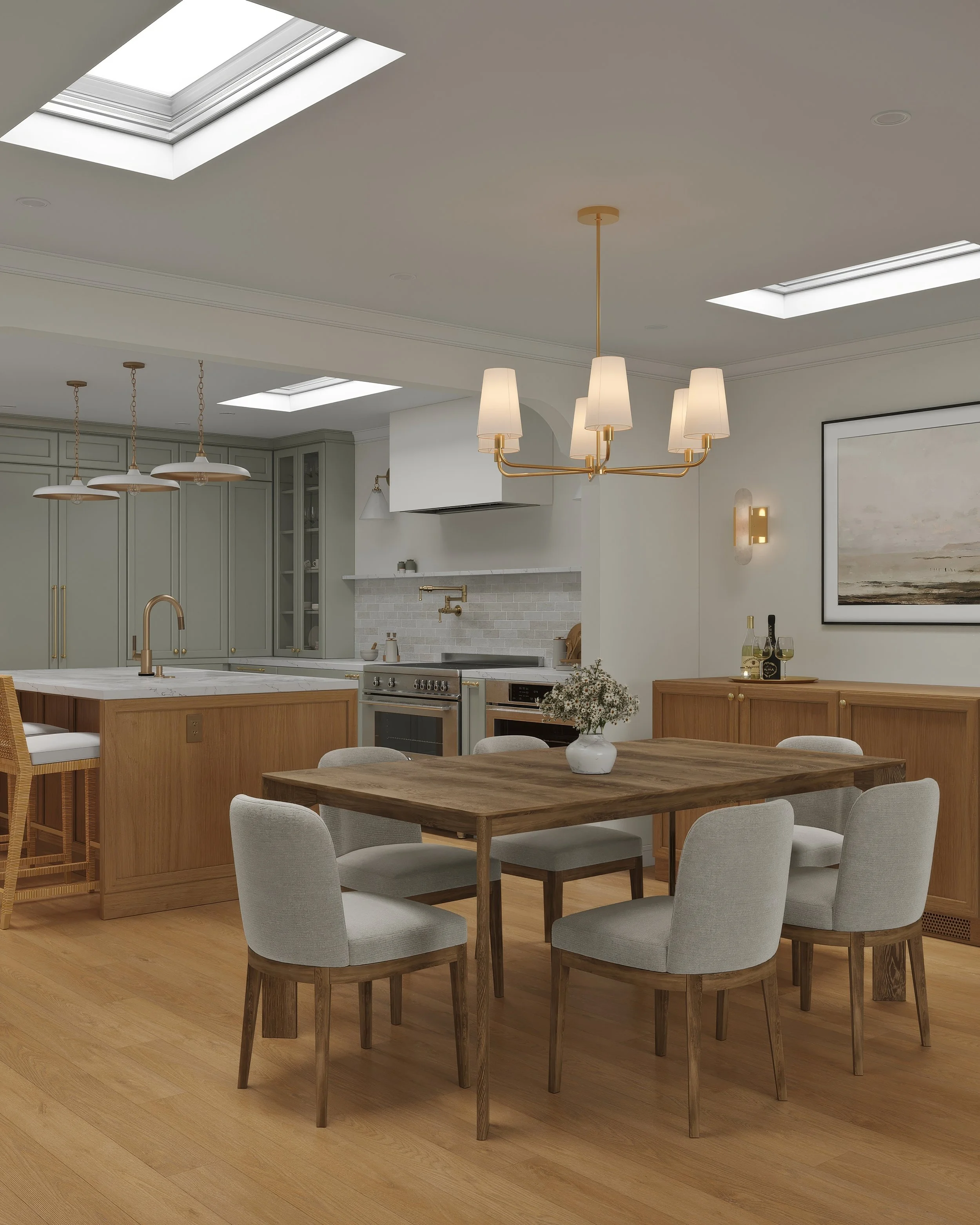 The primary design challenge was to expand usable living space without increasing the building footprint or compromising the home’s historic character. By reworking the existing floor plan and infilling an internal patio and lightwell, the design created a more generous kitchen, dining area, and bathroom. A former closet was repurposed as a discreet half-bath, providing a dedicated powder room for guests. Strategically placed skylights further transform the interior, introducing abundant daylight and creating bright, welcoming spaces that feel both contemporary and rooted in the home’s original fabric.