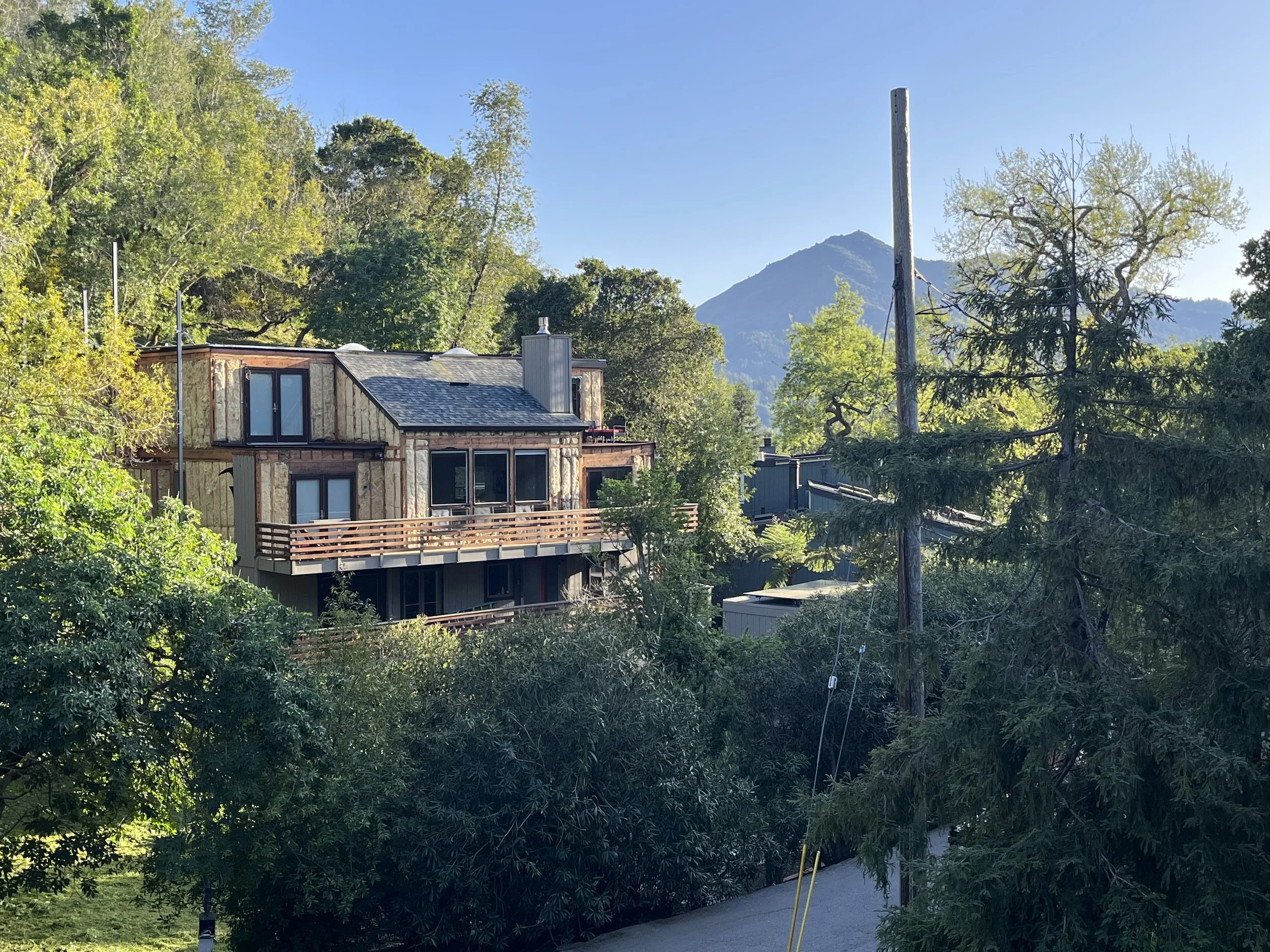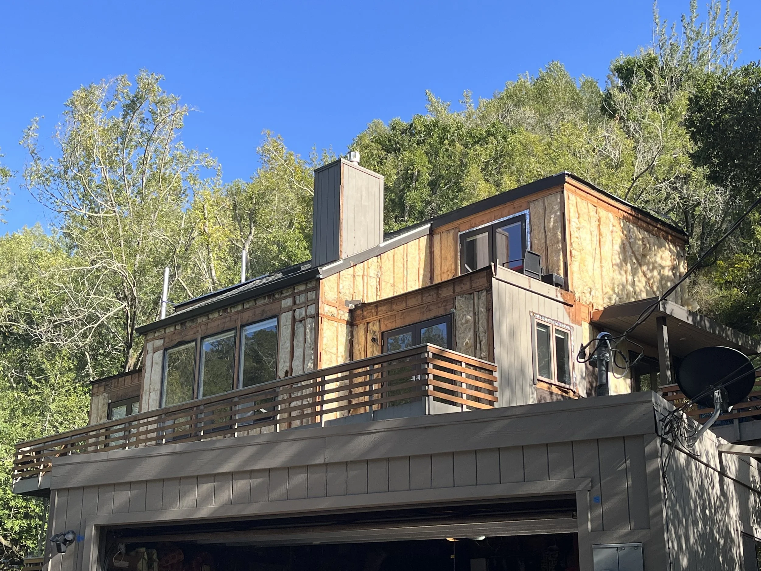 We embarked on a project to revamp the house using modern fire-resistant materials, seizing the opportunity to emphasize its existing pleasing proportions. We reconfigured the windows to offer better vistas and addressed architectural deficiencies. Additionally, we relocated the entry to harmonize with the house's symmetry. To improve the entry experience and facilitate access to the front yard from the house, we introduced a new staircase and deck. Furthermore, we're planning to excavate the underside of the house, creating a wine cave and recreation room as part of the enhanced entry experience.